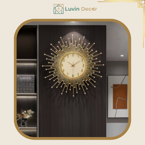 Mẫu đồng hồ treo tường decor mặt trời vàng cao cấp phù hợp treo trang trí phòng khách, mang lại vẻ đẹp đẳng cấp cho không gian nội thất.