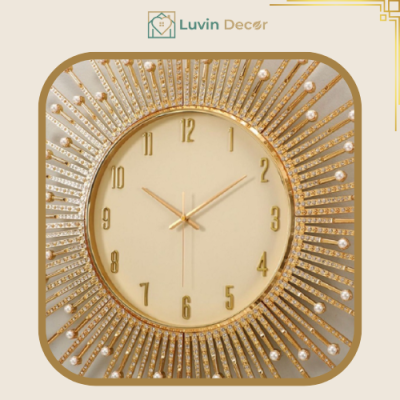 Đồng hồ treo tường tia mặt trời vàng cao cấp là sản phẩm cao cấp và sang trọng, được thiết kế và sản xuất vô cùng tỉ mỉ với nhiều hạt đá sáng bóng gắn trên những tia mặt trời được sơn vàng.